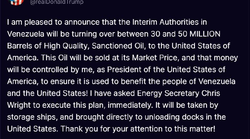 I am pleased to announce that the Interim Authorities in Venezuela will be turning over between 30 and 50 MILLION Barrels of High Quality, Sanctioned Oil, to the United States of America. This Oil will be sold at its Market Price, and that money will be controlled by me, as President of the United States of America, to ensure it is used to benefit the people of Venezuela and the United States! I have asked Energy Secretary Chris Wright to execute this plan, immediately. It will be taken by storage ships, and brought directly to unloading docks in the United States. Thank you for your attention to this matter!