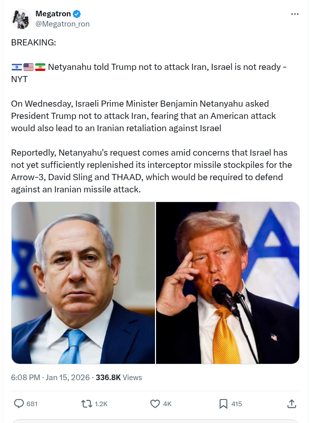 ๐Ÿšจ๐Ÿ‡ฎ๐Ÿ‡ฑ๐Ÿ‡บ๐Ÿ‡ธ๐Ÿ‡ฎ๐Ÿ‡ท Netyanahu told Trump not to attack Iran, Israel is not ready – NYT – Megatron