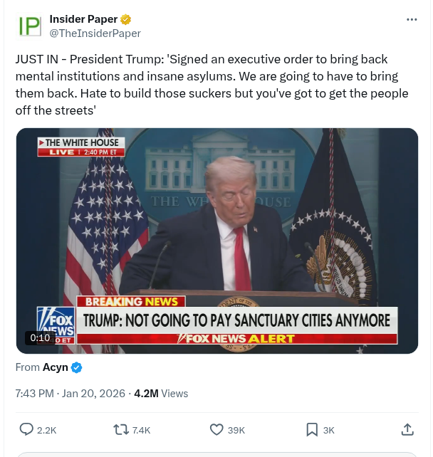 🚨 Just In – President Trump: ‘Signed An Executive Order To Bring Back Mental Institutions And Insane Asylums. We Are Going To Have To Bring Them Back. Hate To Build Those Suckers But You’ve Got To Get The People Off The Streets’