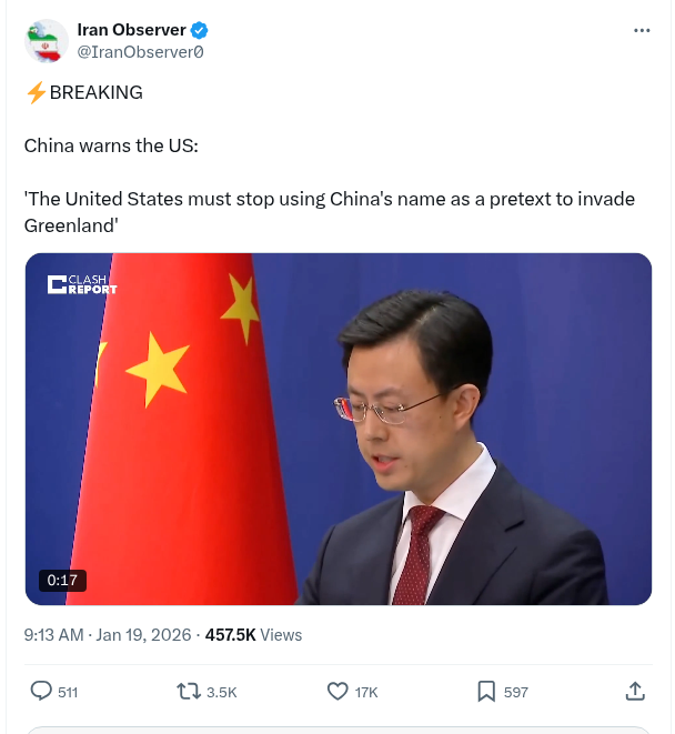🚨BREAKING: China Warns the US: ‘The United States must stop using China’s name as a pretext to invade Greenland’ – Iran Observer