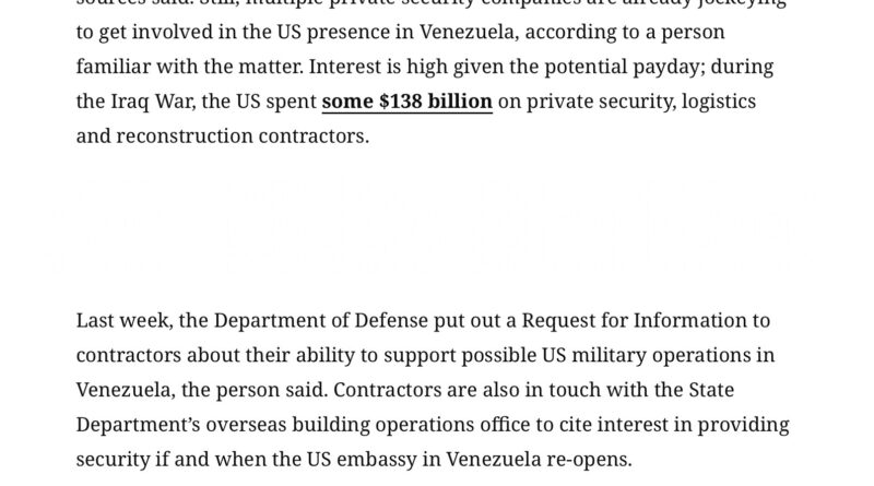 ๐Ÿ›ข ๐Ÿ‡บ๐Ÿ‡ธ ๐Ÿ‡ป๐Ÿ‡ช “The Trump administration is preparing to use private military contractors to protect oil & energy assets in Venezuela rather than deploying US troops, sources tell us, setting up a potential boon for security firms w/… – David Avocado Wolfe