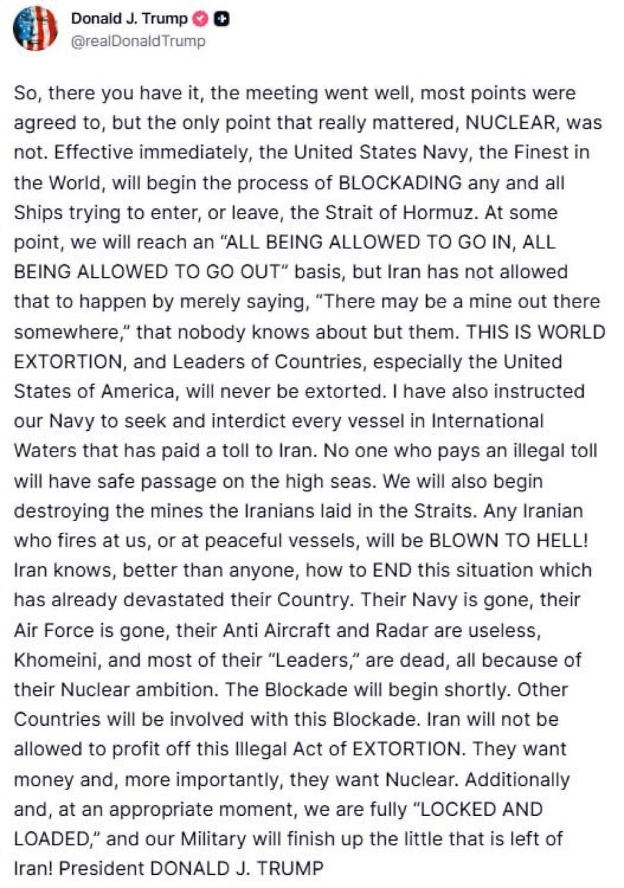 —❗️🇺🇸/🇮🇷 BREAKING: President Trump announces a naval blockade on Iran ‘effective immediately’