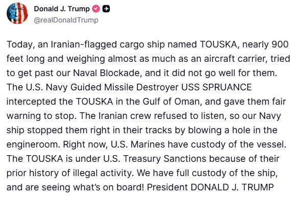 โ€˜Today, an Iranian-flagged cargo ship named TOUSKA, nearly 900 feet long and weighing almost as much as an aircraft carrier, tried to get past our Naval Blockade, and it did not go well for them.