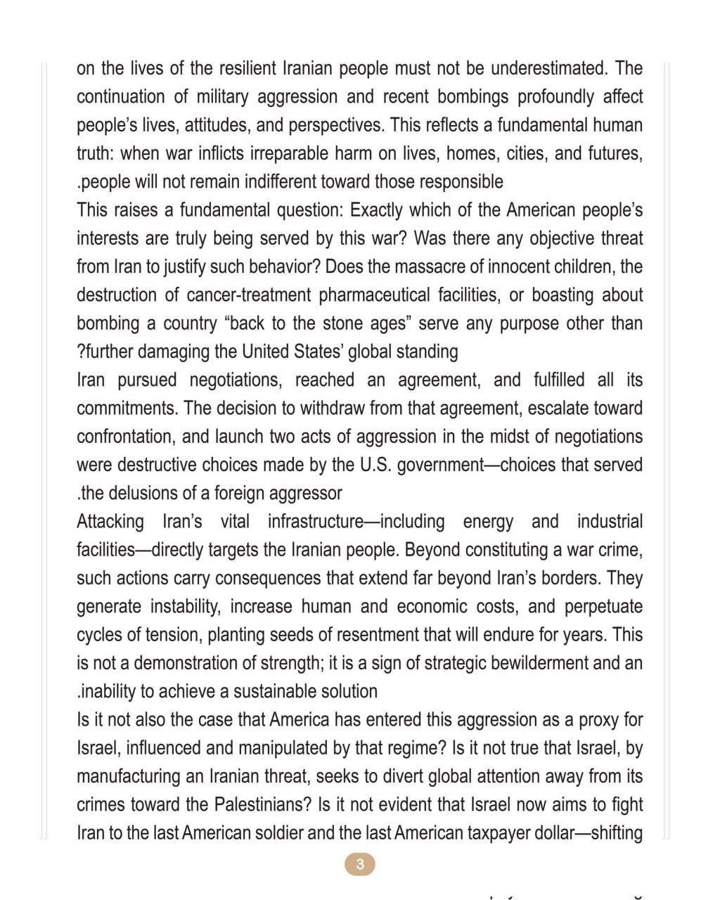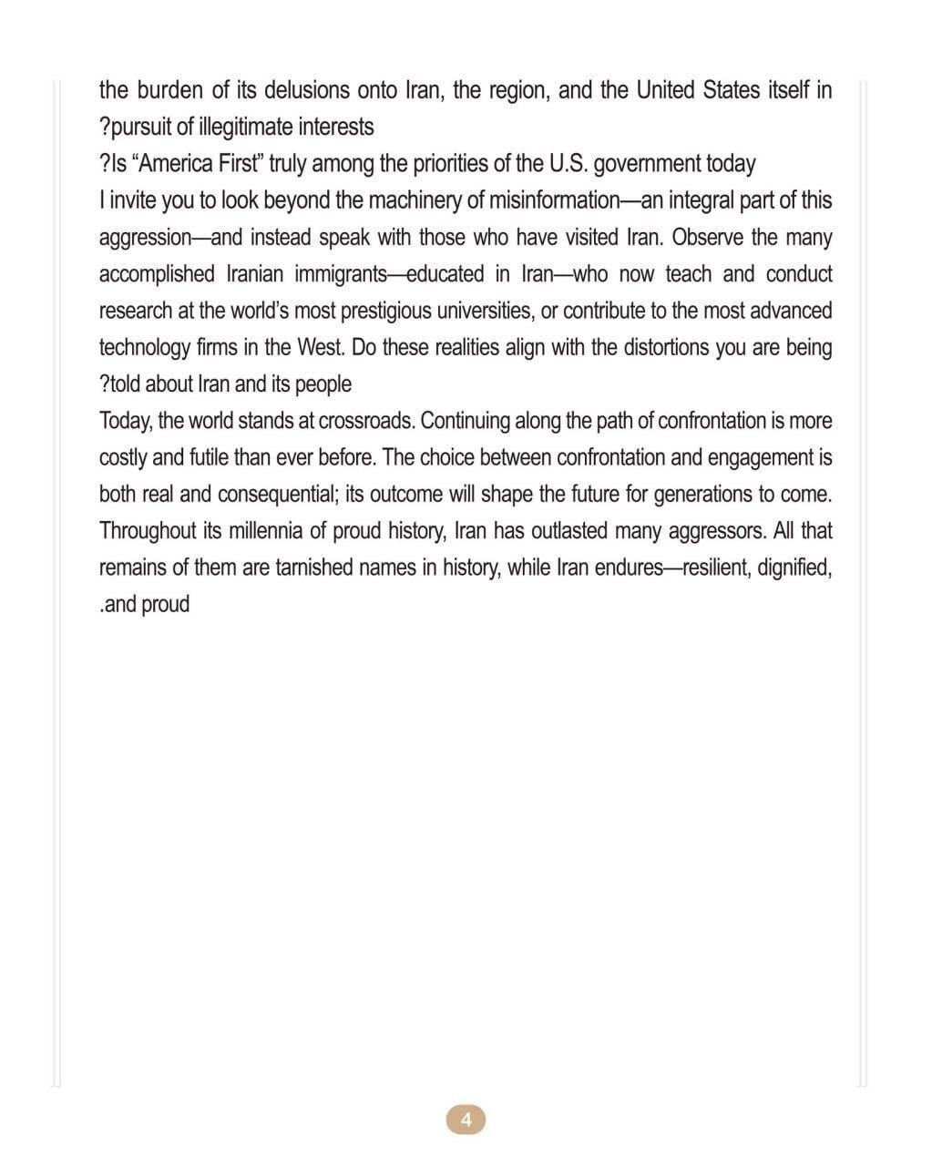 ❗️In Iranian President Masoud Pezeshkian’s letter addressed to the people of the United States of America, he challenges US citizens to see beyond political narratives, question whether “America First” truly reflects the priorities of the US government today, and warns that continued confrontation serves hidden interests and risks shaping a more dangerous future.