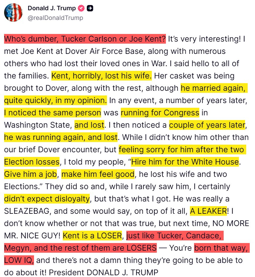 President Trump on Truth Social wondering whoโs dumber, Tucker or Joe Kent โ and reflecting back into his history with the latter