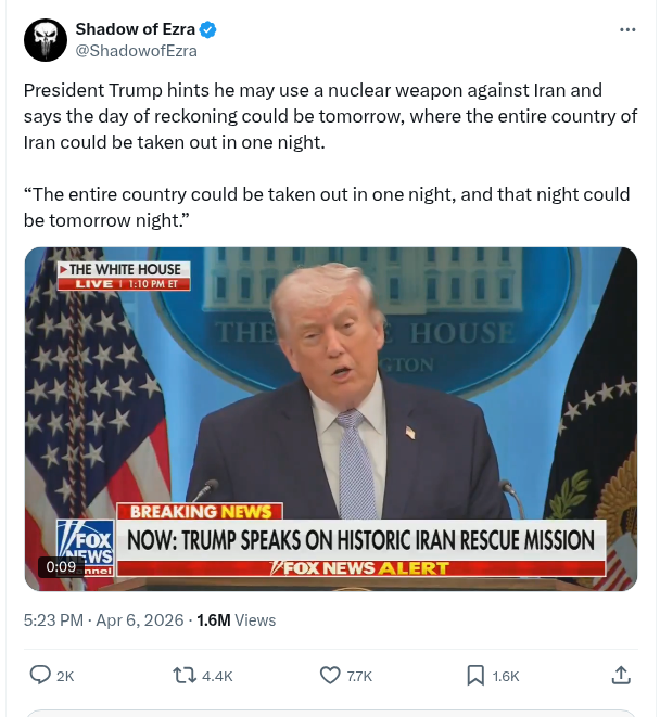 Related: 4/5 — Spoke With President Trump. He Told Me The Conflict Should Be Over In Days, Not Weeks But If No Deal Is Made He’s Blowing Up The Whole Country With “Very Little” Off The Table.