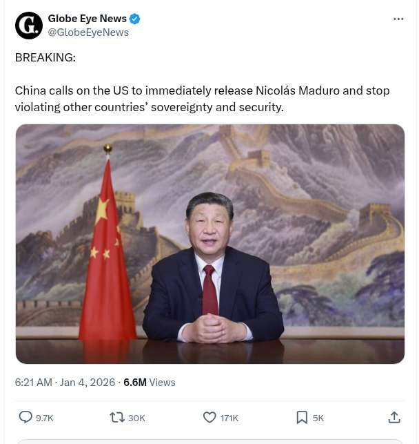 🚨🇨🇳🇺🇸🇻🇪BREAKING: China calls on the US to immediately release Nicolás Maduro and stop violating other countries’ sovereignty and security.
