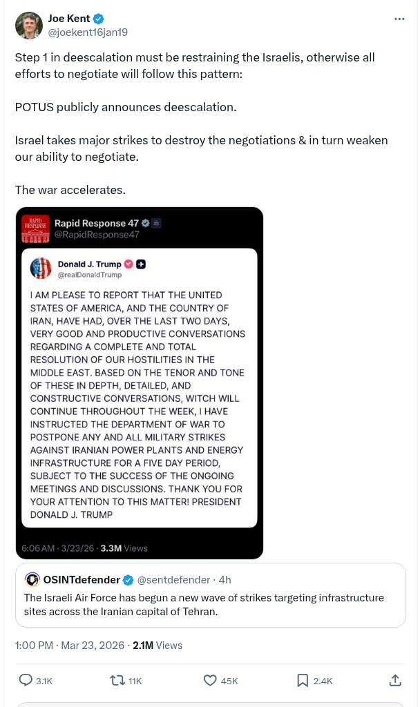 ย ๐จ๐บ๐ธ๐ฎ๐ฑ Joe Kent Post: Step 1 In Deescalation Must Be Restraining The Israelis, Otherwise All Efforts To Negotiate Will Follow This Pattern: