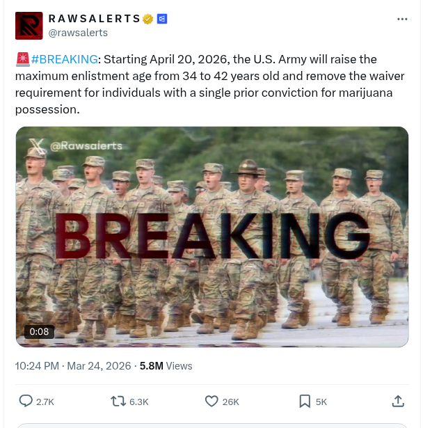 ๐จ๐บ๐ธ๐BREAKING: Starting April 20, 2026, The U.S. Army Will Raise The Maximum Enlistment Age From 34 To 42 Years Old And Remove The Waiver Requirement For Individuals With A Single Prior Conviction For Marijuana Possession. – R A W S A L E R T S