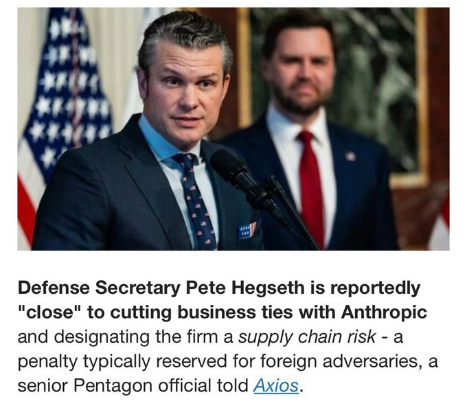 Defense Secretary Hegseth reportedly “close” to classifying Anthropic as supply chain risk. All defense contractors must certify zero anthropic or lose contracts.
