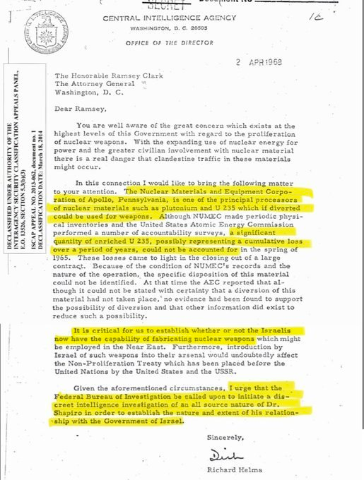 1968 CIA Director Wrote A Letter Demanding FBI Investigate Suspected Israel Theft Of Hundreds Of Pounds Of US Weapons-Grade Uranium From Numec, Run By Dr. Shapiro, Who Had Close Ties To The Israeli Government. – ĐⱤØ₲Ø