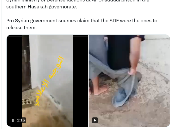 Read MoreVideo | Footage Reportedly Shows ISIS Members Being Released By Syrian Ministry Of Defense Factions At Al-Shaddadi Prison In The
