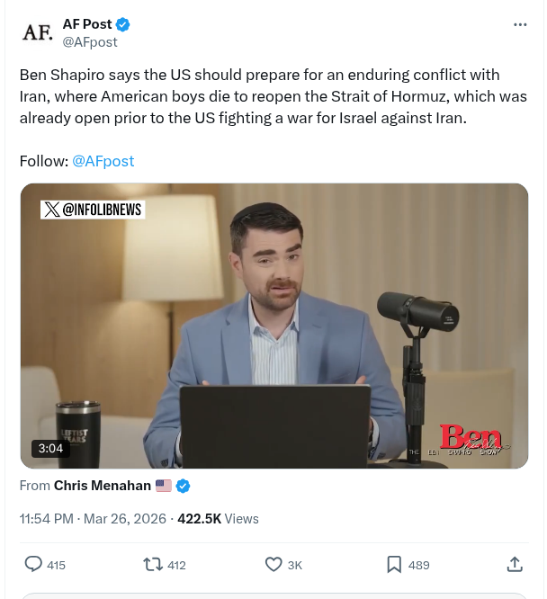 Ben Shapiro Says The US Should Prepare For An Enduring Conflict With Iran, Where American Boys Die To Reopen The Strait Of Hormuz, Which Was Already Open Prior To The US Fighting A War For Israel Against Iran. – AF Post