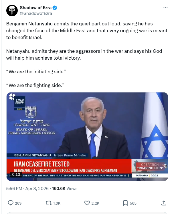Related: 4/8 — 😈🇮🇱🇺🇸🇮🇱🔫🕊 Benjamin Netanyahu Rejects President Trump’s Ceasefire And Says The War Will Continue Against Iran At Any Time He Chooses.
