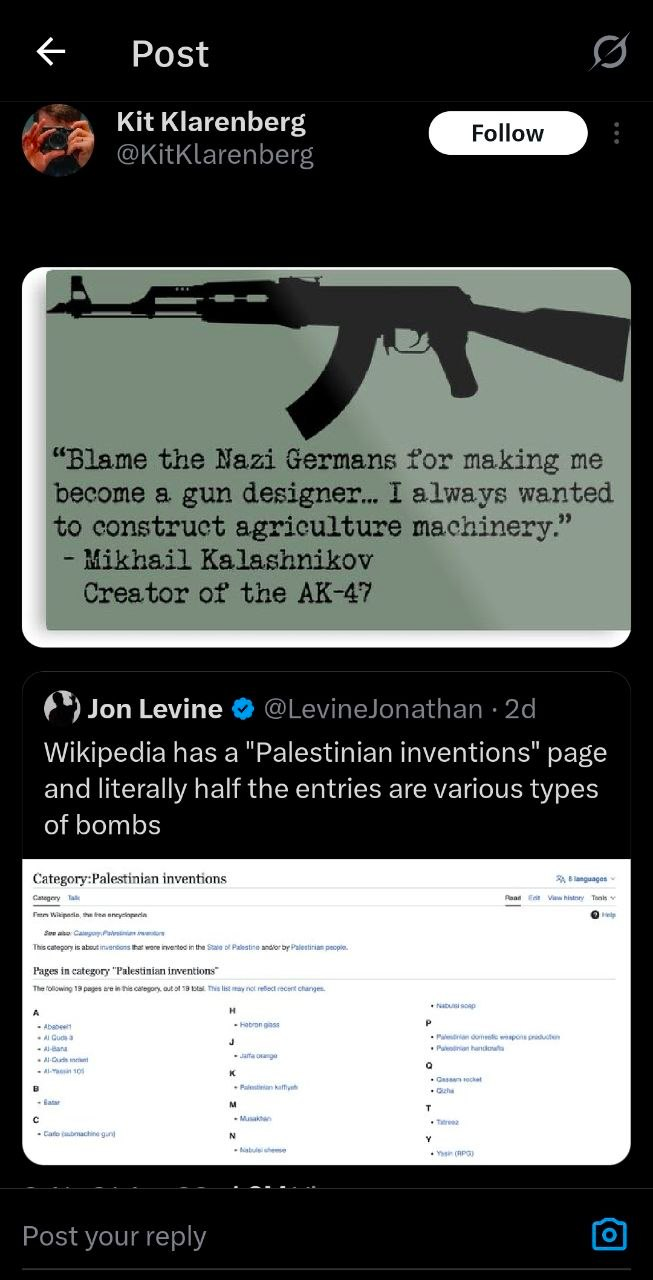 Kit Klarenbergs’ Response to ” Wikipedia has a ‘Palestinian inventions’ page and literally half the entries are various types of bombs “