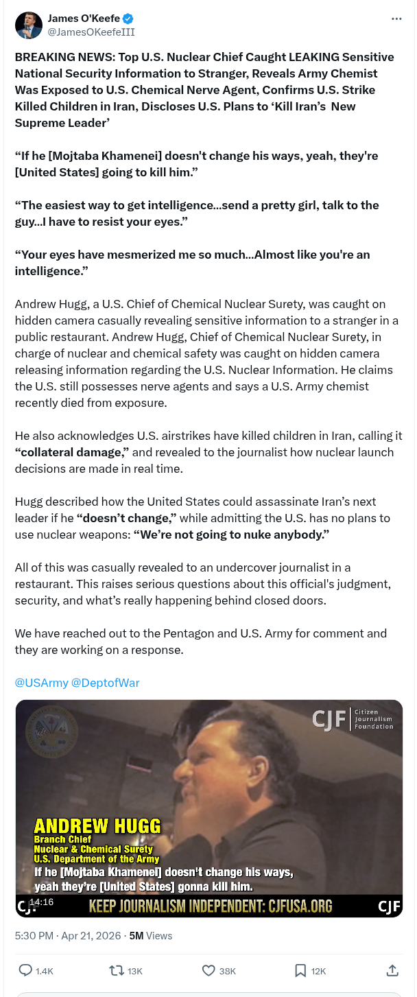 Update: 4/21 — US Nuclear Chief Andrew Hugg Has Been Escorted Out Of The Pentagon