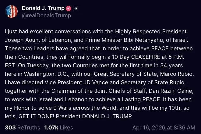 BREAKING | Trump announces 10-day ceasefire between Lebanon and Israel, hinting it is linked to face-to-face talks in Washington in order to undermine Iran’s push for a ceasefire in Lebanon.