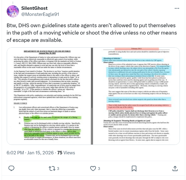 Btw, DHS Own Guidelines State Agents Aren’t Allowed To Put Themselves In The Path Of A Moving Vehicle Or Shoot The Drive Unless No Other Means Of Escape Are Available.
