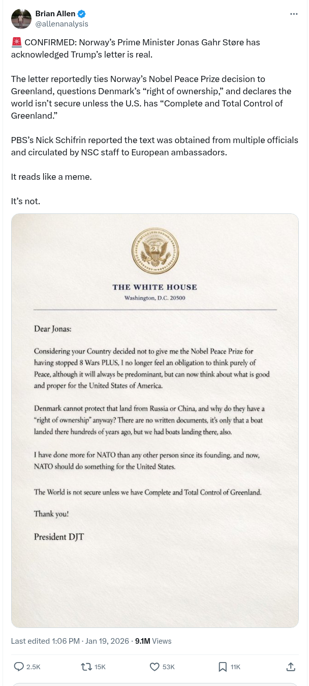 Confirmed: Norway’s Prime Minister Jonas Gahr Støre Has Acknowledged Trump’s Letter Is Real – The Letter Reportedly Ties Norway’s Nobel Peace Prize Decision to Greenland, questions Denmark’s “Right of Ownership,” and Declares The World isn’t Secure Unless the U.S. Has “Complete and Total Control of Greenland.”