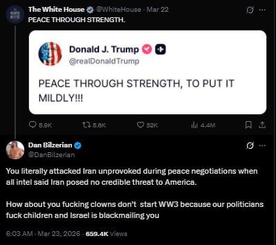 Dan Bilzerian in Response to White House Account Posting ‘PEACE THROUGH STRENGTH’: You Literally Attacked Iran Unprovoked During Peace Negotiations When All Intel Said Iran Posed No Credible Threat To America.