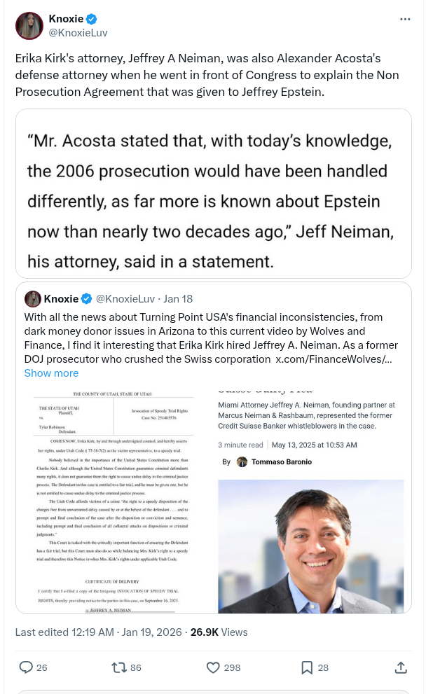 Erika Kirk’s Attorney, Jeffrey A Neiman, Was Also Alexander Acosta’s Defense Attorney When He Went In Front Of Congress To Explain The Non Prosecution Agreement That Was Given To Jeffrey Epstein.