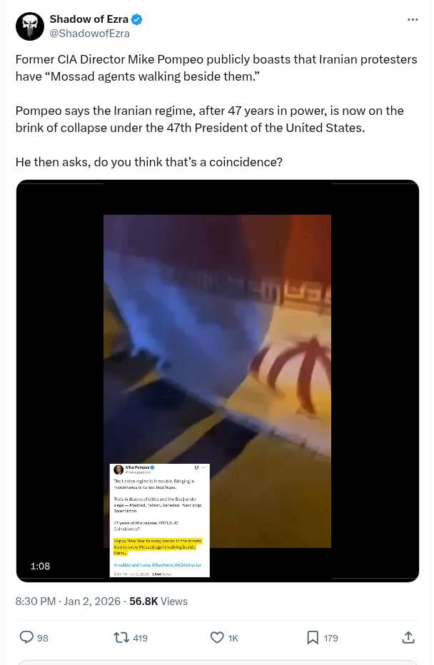 Former CIA Director Mike Pompeo Publicly Boasts That Iranian Protesters Have “Mossad Agents Walking Beside Them.”
