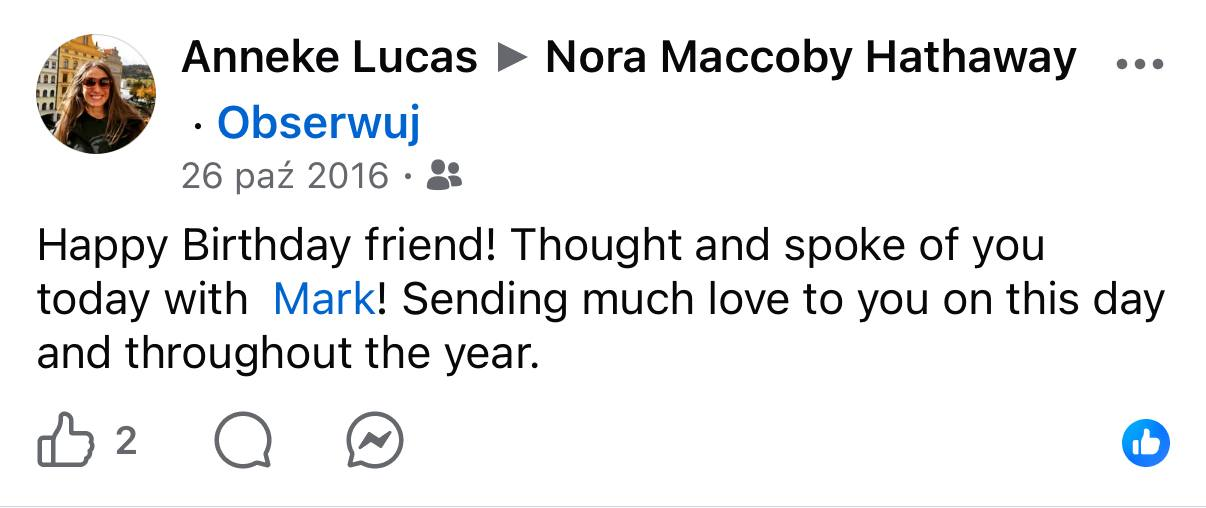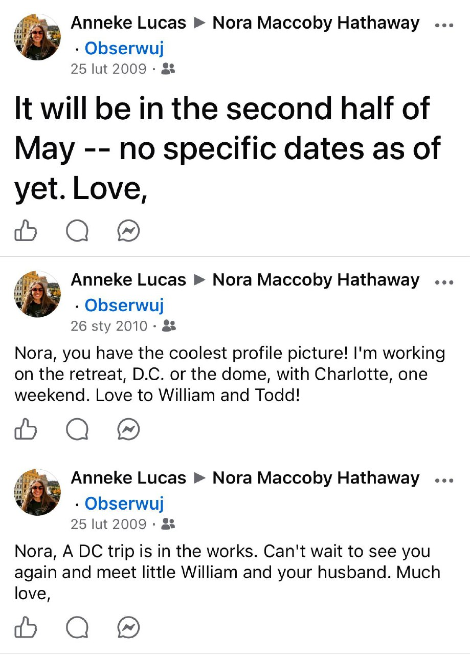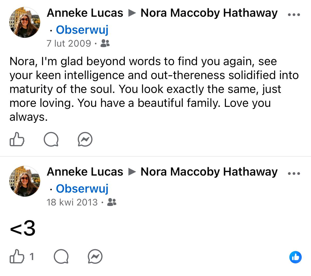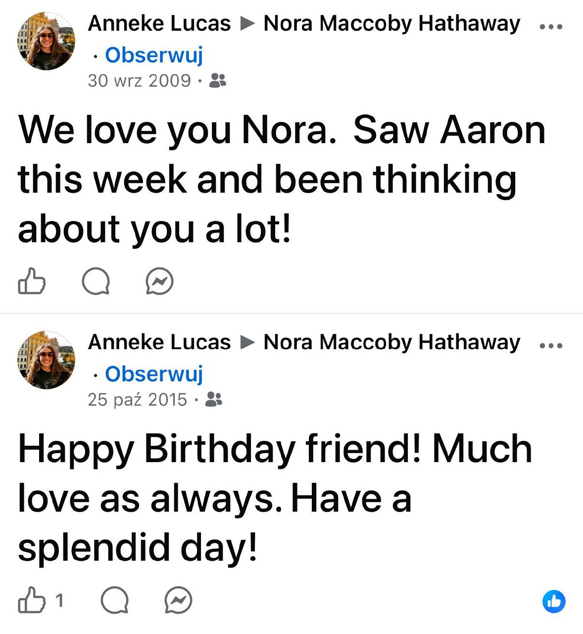 Here there are some interactions between Nora Maccoby and Anneke Lucas (who know each other for 35 years) throughout online history. Nora Maccoby and her family were closely involved with James Alefantis. One of the screenshots shows Anneke mentioning Aaron. Not sure if the same but Aaron Cohen is famous child slave rescuer, friend of Nora Maccoby, in one of the instances he liked photo of kids playing ping pong at Alefantis restaurant Comet Ping Pong. I have also found X profiles created back in 2019, both in July. One of them named Aharon another one named Noor and they follow only each other. Cool feature! Or a bug.