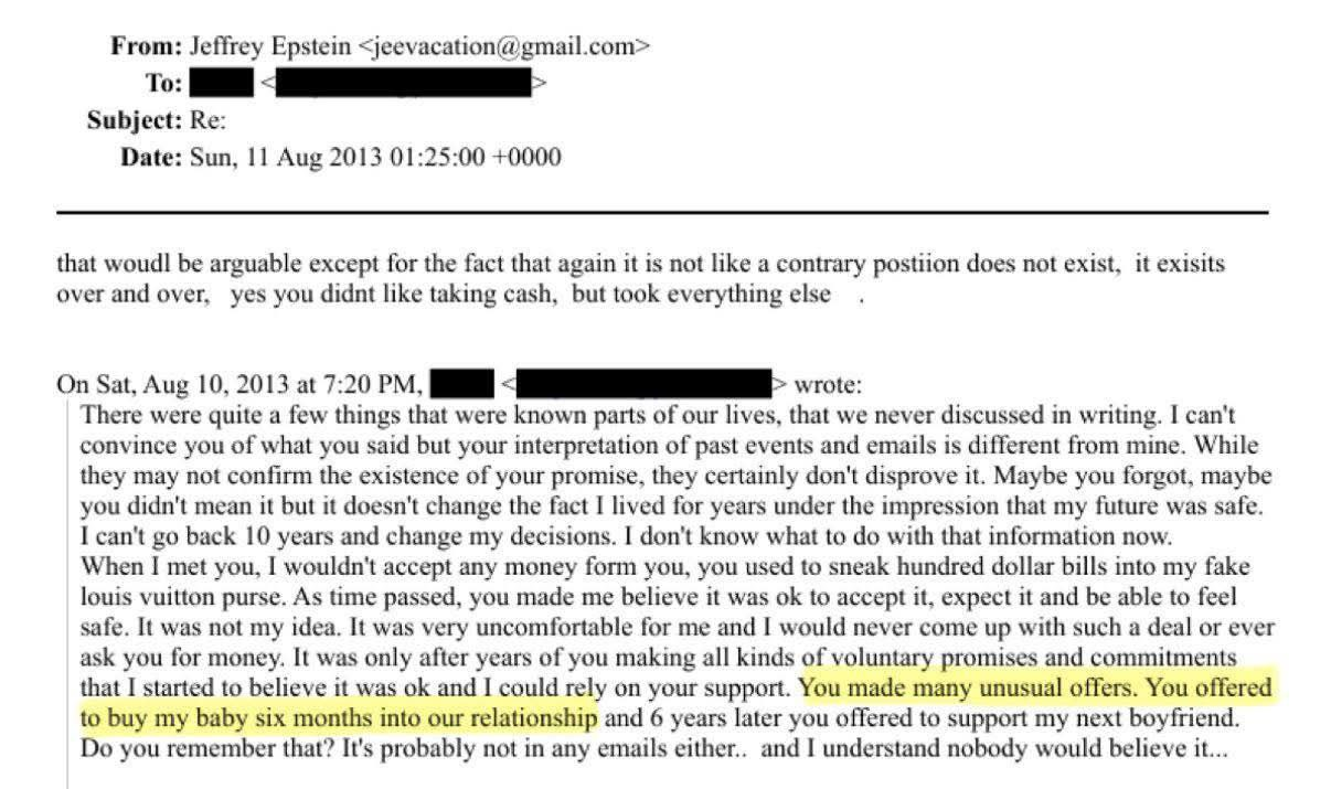 In 2013, someone said to Epstein in an email: “You offered to buy my baby six months into our relationship.”