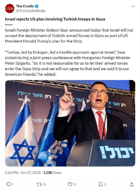 Israeli Foreign Minister Gideon Saar announced today that Israel will not accept the deployment of Turkish armed forces in Gaza as part of US President Donald Trump’s plan for the Strip.