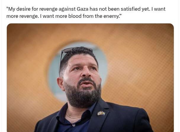 Israeli Deputy Minister And Knesset Member Almog Cohen Said His Appetite For Bloodshed In Gaza Remains Unfulfilled: “My desire for revenge against Gaza has not been satisfied yet. I want more revenge. I want more blood from the enemy.”