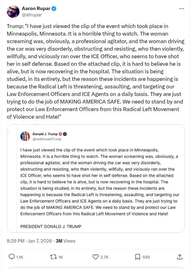 Trump’s Post On Minneapolis Murder of American Civilian by ICE: