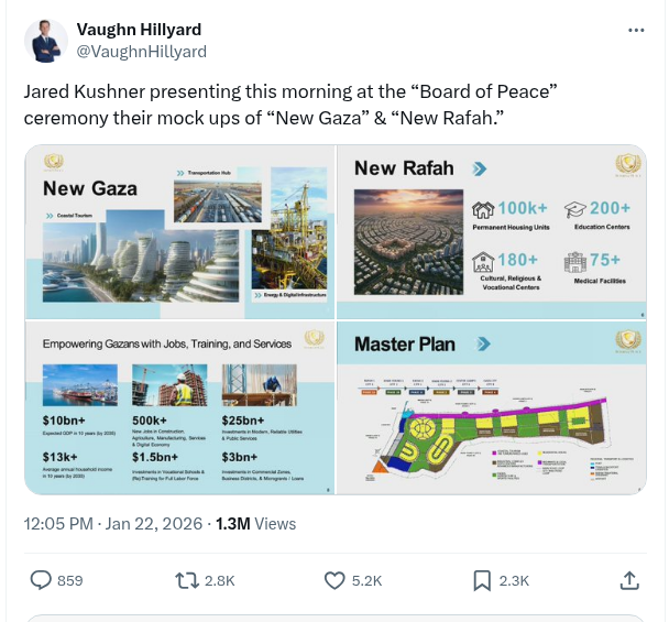 Jared Kushner Presenting This Morning At The “Board Of Peace” Ceremony Their Mock Ups Of”New Gaza” & “New Rafah.”