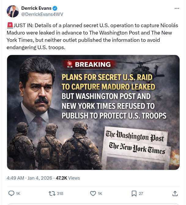 Just In: Details Of A Planned Secret U.S. Operation To Capture Nicolás Maduro Were Leaked In Advance To The Washington Post And The New York Times, But Neither Outlet Published The Information To Avoid Endangering U.S. Troops.