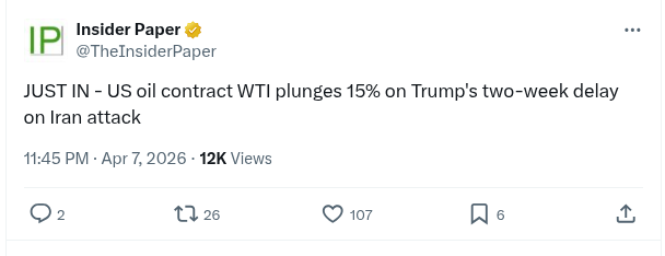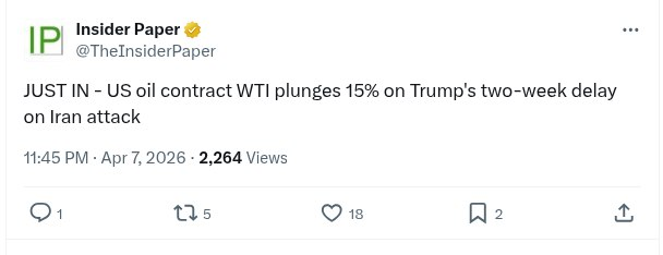 Just In – US Oil Contract Wti Plunges 15% On Trump’s Two-Week Delay On Iran Attack – Insider Paper