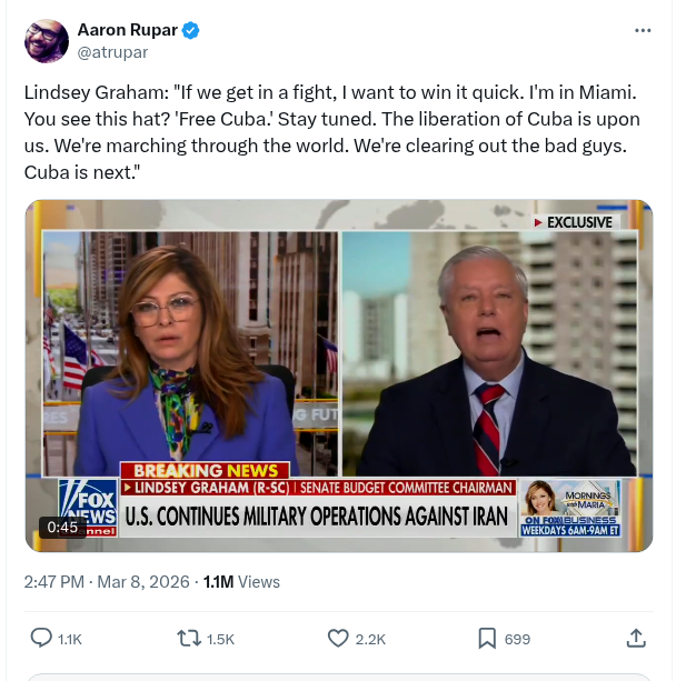 Lindsey Graham: “If We Get In A Fight, I Want To Win It Quick. I’m In Miami. You See This Hat? ‘free Cuba.’ Stay Tuned. The Liberation Of Cuba Is Upon Us. We’re Marching Through The World. We’re Clearing Out The Bad Guys. Cuba Is… – Aaron Rupar