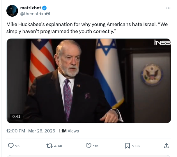 Mike Huckabee’s Explanation For Why Young Americans Hate Israel: “We Simply Haven’t Programmed The Youth Correctly.” – matrixbot