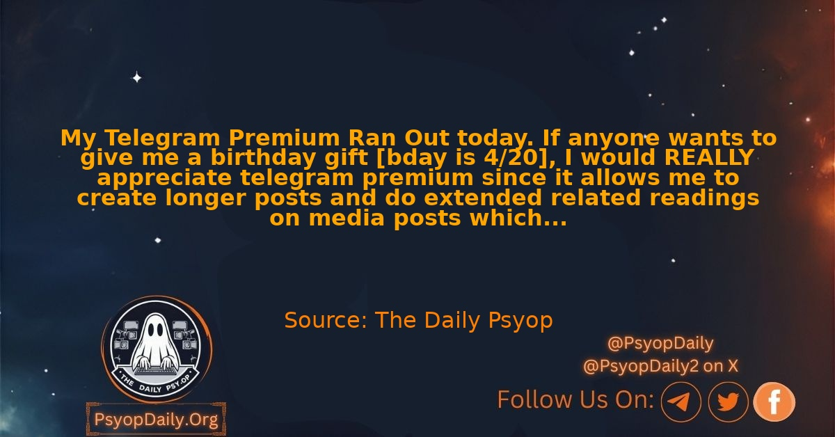 My Telegram Premium Ran Out today. If anyone wants to give me a birthday gift [bday is 4/20], I would REALLY appreciate telegram premium since it allows me to create longer posts and do extended related readings on media posts which… – The Daily Psyop