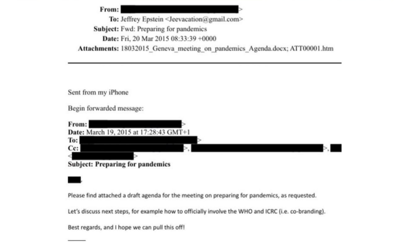 New: Epstein and and Redacted Person are preparing for Pandemics in the new released email — “Let’s discuss next steps, for example how to officially involve the WHO and CDC…