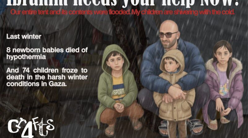 Related: 12/22/25 โ€” From the heart of Gaza’s harsh winter โ„๏ธ๐ŸŒง, I โ€“ Ibrahim โ€“ and my family of five are battling the cold and rain inside a tent that has withstood everything. โ›บ๏ธ๐Ÿ’ง Our shelter has been flooded, and we are shivering from the cold ๐Ÿฅถ๐Ÿ’”, but we haven’t lost hope. โœจโค๏ธ We need your help โ€“ any support from you will ease the hardship of this winter and give us a chance to persevere through what we are facing. ๐Ÿ™๐Ÿคฒ Please share this post ๐Ÿ”„ or spread our story ๐Ÿ—ฃ so it reaches someone who can help. ๐Ÿ’–