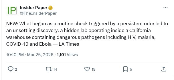 New: What Began As A Routine Check Triggered By A Persistent Odor Led To An Unsettling Discovery: A Hidden Lab Operating Inside A California Warehouse Containing Dangerous Pathogens Including Hiv, Malaria, Covid-19 And Ebola – La Times – Insider Paper