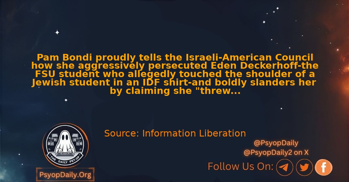 Pam Bondi proudly tells the Israeli-American Council how she aggressively persecuted Eden Deckerhoff—the FSU student who allegedly touched the shoulder of a Jewish student in an IDF shirt—and boldly slanders her by claiming she “threw her phone” at him.