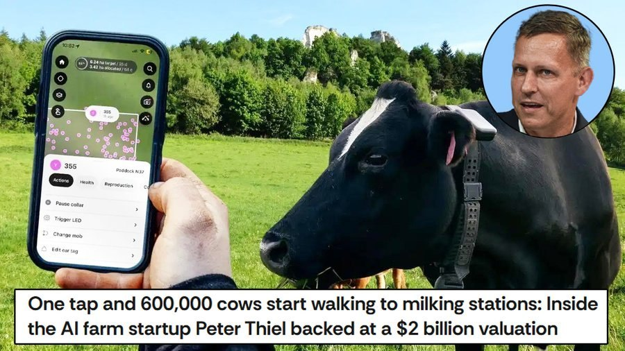 Peter Thiel Just Backed An AI System That Can Herd 600,000 Cows With One Tap. It’s Called Halter. The System Uses GPS collars and Behavioral Science to Train Cows to Obey Algorithmic Sound Cues While Tracking Their Vitals, Location, Stress, and Compliance