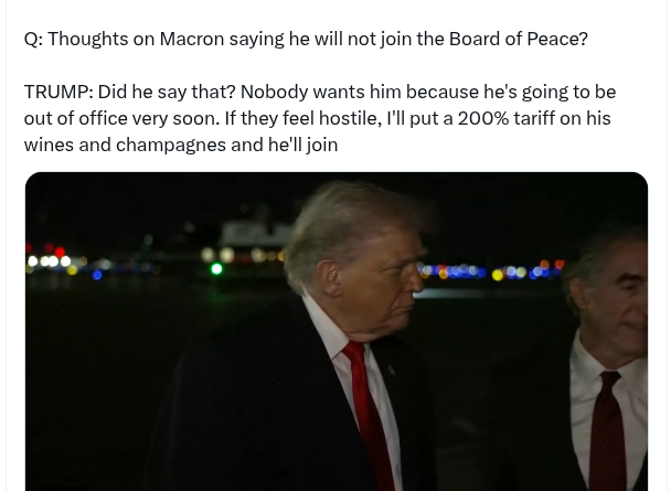 TRUMP: Did he say that? Nobody wants him because he’s going to be out of office very soon. If they feel hostile, I’ll put a 200% tariff on his wines and champagnes and he’ll join