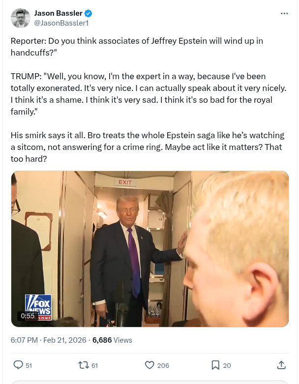 His smirk says it all. Bro treats the whole Epstein saga like he’s watching a sitcom, not answering for a crime ring. Maybe act like it matters? That too hard?