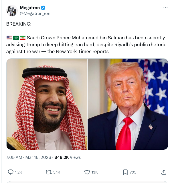 Saudi Crown Prince Mohammed bin Salman has been secretly advising Trump to keep hitting Iran hard, despite Riyadh’s public rhetoric against the war – the New York Times reports