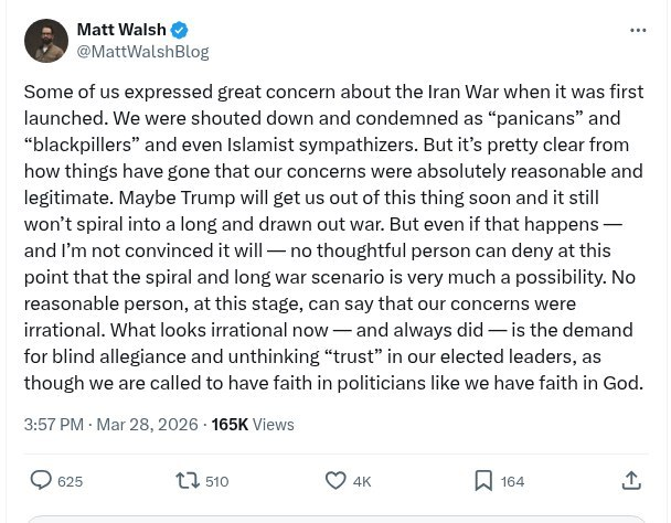 Some Of US Expressed Great Concern About The Iran War When It Was First Launched. We Were Shouted Down And Condemned As “Panicans” And”Blackpillers” And Even Islamist Sympathizers. But It’s Pretty Clear From How Things Have Gone That Our Concerns Were Absolutely Reasonable And Legitimate. Maybe Trump Will Get US Out Of This Thing Soon And It Still Won’t Spiral Into A Long And Drawn Out War. But Even If That Happens — And I’m Not Convinced It Will — No Thoughtful Person Can Deny At This Point That The Spiral And Long War Scenario Is Very Much A Possibility. No Reasonable Person, At This Stage, Can Say That Our Concerns Were Irrational. What Looks Irrational Now — And Always Did — Is The Demand For Blind Allegiance And Unthinking “Trust” In Our Elected Leaders, As Though We Are Called To Have Faith In Politicians Like We Have Faith In God.