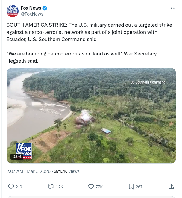 “We are bombing narco-terrorists on land as well,” War Secretary Hegseth said.
