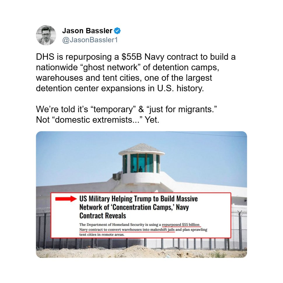 The Department of Homeland Security is using a repurposed $55 billion Navy contract to convert warehouses into makeshift jails and plan sprawling tent cities in remote areas. – Jason Bassler