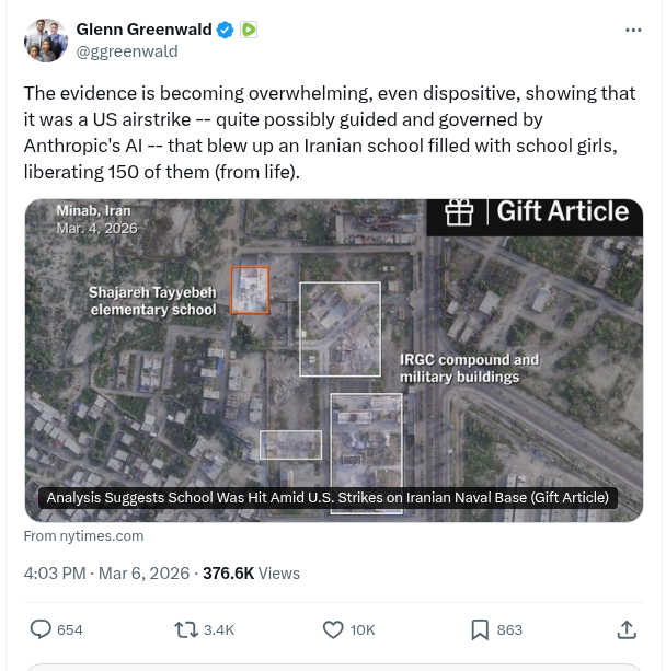 The Evidence Is Becoming Overwhelming, Even Dispositive, Showing That It Was A US Airstrike — Quite Possibly Guided And Governed By Anthropic’s AI — That Blew Up An Iranian School Filled With School Girls, Liberating 150 Of Them (from Life).