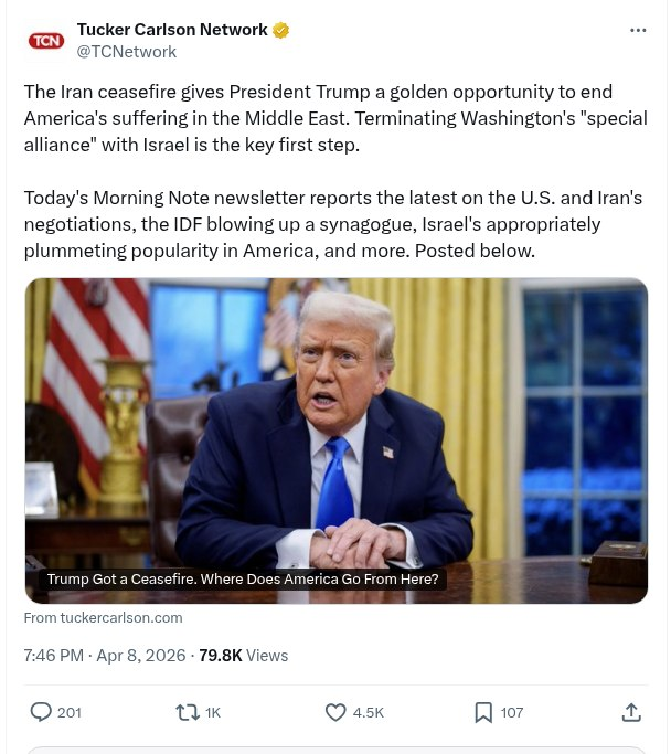 The Iran Ceasefire Gives President Trump A Golden Opportunity To End America’s Suffering In The Middle East. Terminating Washington’s “Special Alliance” With Israel Is The Key First Step. – Tucker Carlson Network